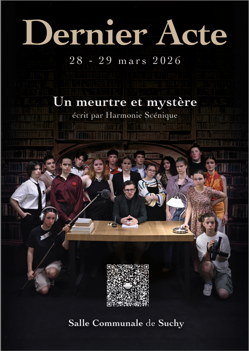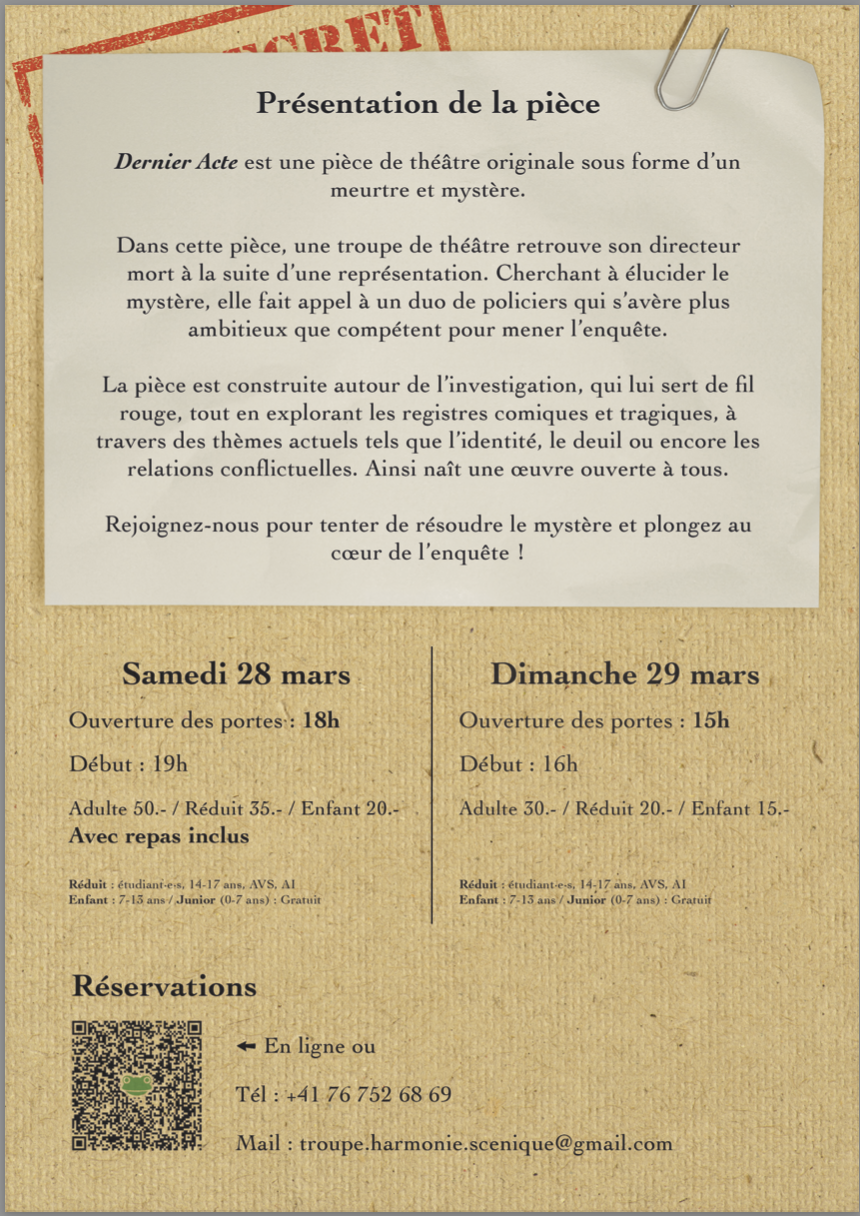 Un directeur retrouvé mort, une troupe sous tension et un duo de policiers aussi ambitieux que maladroit : Dernier Acte vous plonge dans un meurtre et mystère captivant où chaque détail compte. Pour en savoir plus et ne rien manquer de ce spectacle haletant, découvrez toutes les informations sur le flyer ci-dessous !
