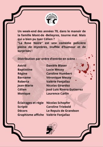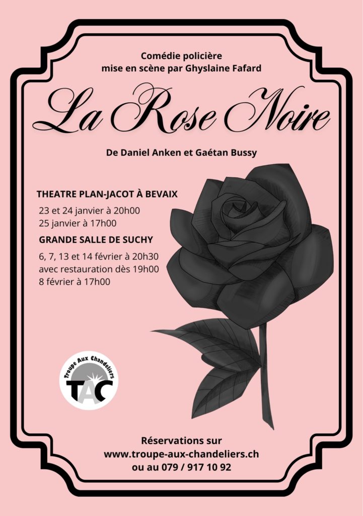 Les 6, 7, 8, 13 et 14 février, la Troupe Aux Chandeliers vous invite à découvrir « La Rose Noire », une comédie policière pleine d’humour, plongée dans l’ambiance des années 70, à la Grande Salle de Suchy.